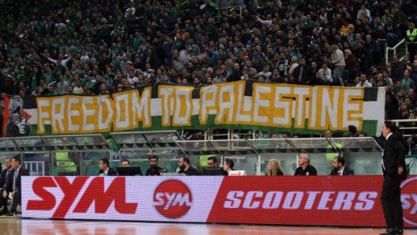 «Λευτεριά στην Παλαιστίνη» υψώνοντας πίσω από το πάγκο της
