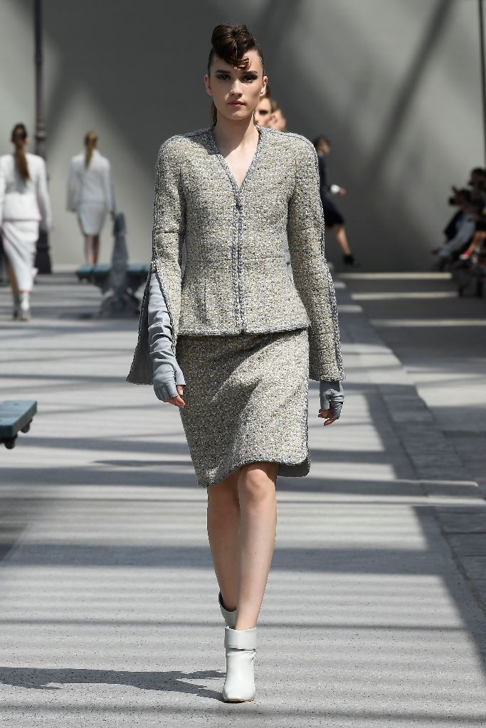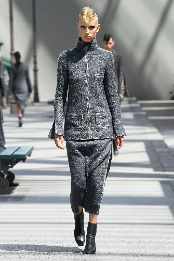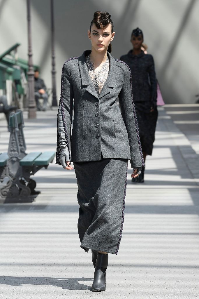 Pencil φούστες και ψυχρές αποχρώσεις κυριάρχησαν στην πασαρέλα. Μπορείτε να δείτε περισσότερα σχέδια στις εικόνες που ακολουθούν.